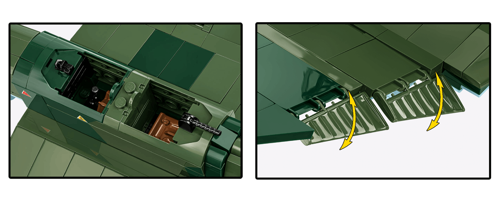 • Bewegliche Elemente – Das Flugzeug verfügt über einen beweglichen Propeller, Querruder und drehbare Räder mit Gummireifen. Das Cockpit lässt sich öffnen und ermöglicht es, Pilotenfiguren im Modell zu platzieren.
