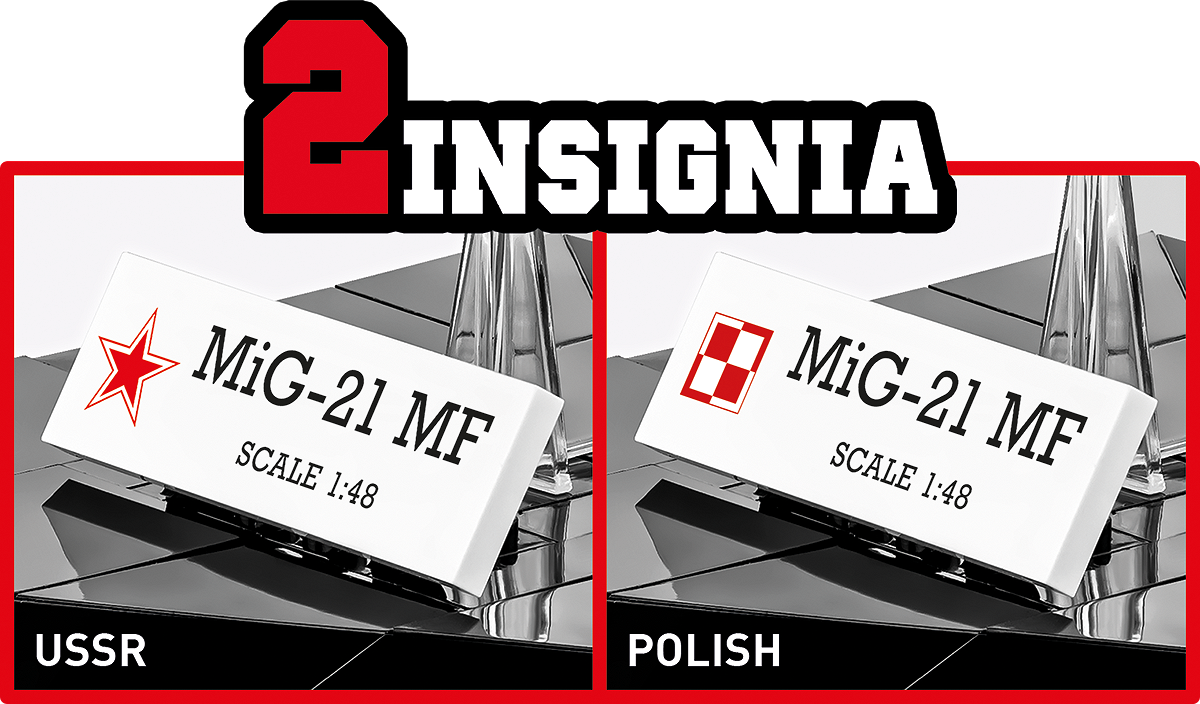 Interaktivität und Dekoration – die zusammengebaute MiG-21MF ist sowohl ein beeindruckendes Ausstellungsstück als auch ein spannendes Spielmodell, ideal für junge und ältere Luftfahrtbegeisterte. Sammlerständer – das Set kann auf einem stabilen Ständer mit Kunststoffstift präsentiert werden. Zwei zusätzliche Beschriftungstafeln enthalten den Setnamen, den Maßstab und die polnischen bzw. sowjetischen Markierungen.