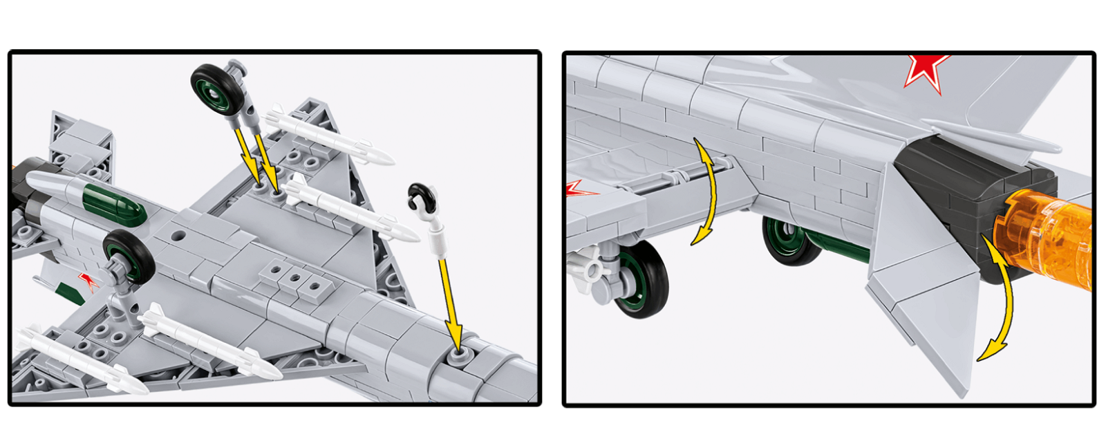 Realistische Funktionalität – Das Modell verfügt über bewegliche Steuerflächen, abnehmbare Räder und eine nachgebildete Triebwerksflamme, mit der Start-, Flug- und Landeszenen nachgestellt werden können. Unter den Tragflächen befinden sich Nachbildungen von R-3S-Raketen. Dies sind sowjetische Kurzstrecken-Luft-Luft-Raketen, eine Kopie der amerikanischen AIM-9B Sidewinder.