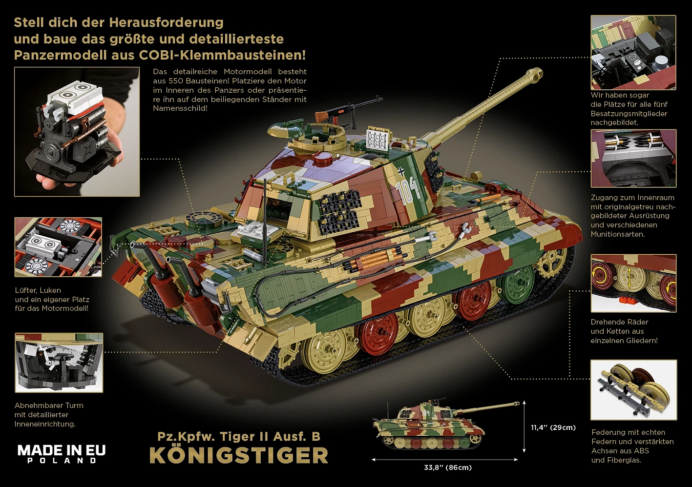 Über 11.000 Teile! – Dies ist nicht nur das größte Tiger-Modell, sondern auch der komplexeste Bausatz, den COBI je hergestellt hat. Die Struktur wurde so konzipiert, dass nicht nur das Äußere, sondern auch die inneren Mechanismen und die Struktur des Fahrzeugs nachgebildet werden. Dies ist eine Bauherausforderung für die erfahrensten Baumeister und bietet die Zufriedenheit hochprofessioneller Modelle! Unglaublicher Realismus – Speziell entwickelte Konstruktionselemente, eine für die späten Tiger-II-Modelle typische dreifarbige Tarnung, ein realistisches Farbschema basierend auf dem Museumsfahrzeug Tiger 104 sowie perfekt reproduzierte Proportionen und Texturen lassen das Modell aus jedem Blickwinkel wie eine Miniaturversion eines echten Panzers aussehen.