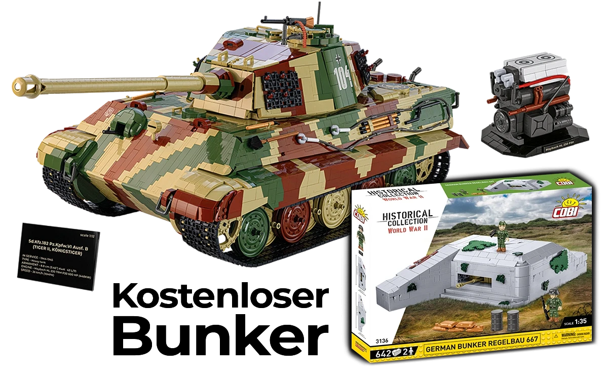 Zweites Set gratis! Zum beeindruckenden Tiger-II-Großmodell erhalten Sie zusätzlich den German Bunker Regelbau 667 im Maßstab 1:35. Dieses hochdetaillierte Modell ermöglicht den Nachbau eines funktionalen Bunkers, eines der wichtigsten Elemente der deutschen Verteidigungsstellungen im Zweiten Weltkrieg. Das Set wird durch zahlreiches Zubehör bereichert, darunter Tarnvegetation, Proviantfässer, Sandsäcke, eine KwK 39 L Panzerabwehrkanone, Funkgeräte, Handgranaten sowie MP-40- und Mauser-Kar98k-Gewehre. Außerdem enthält das Set zwei Figuren deutscher Soldaten.