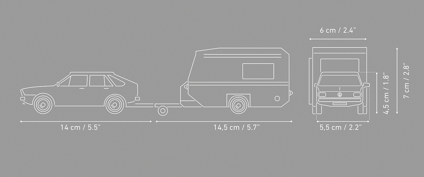 Campingwohnwagen – kompakt, charmant und bereit für jedes Abenteuer. Ideal für die Gestaltung touristischer Szenen. Er kann am Automodell befestigt oder separat in einem Diorama präsentiert werden.