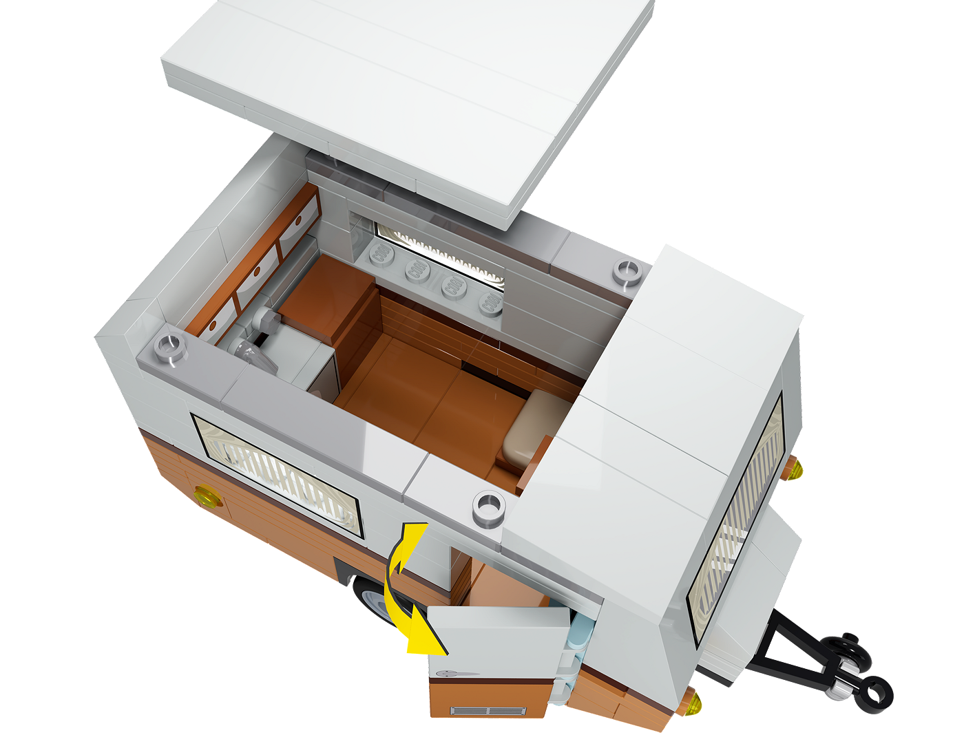 Packe den Anhänger, nimm die Katze mit und starte deine eigene Reise im Retro-Stil aus Bausteinen. Zünde dann den Grill an und genieße die Zeit in der Natur!