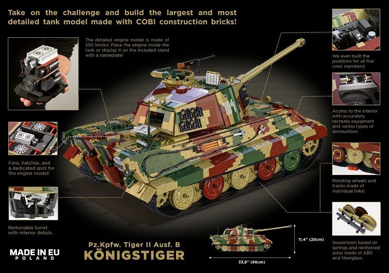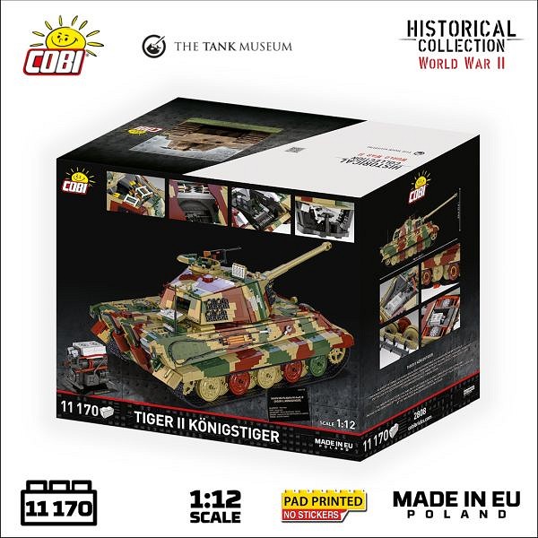 Tiger II Königstiger w skali 1:12 to największy model w historii COBI, powstały we współpracy z The Tank Museum w Bovington. Składa się z 11 170 elementów, które odwzorowują sylwetkę czołgu, jego wnętrze i mechanikę. Model posiada realistyczne barwy kamuflażu, trwałe nadruki, obracającą się wieżę, działającą trakcję gąsienicową, oraz otwierane włazy. W zestawie znajduje się również wyjmowany model silnika Maybach HL-230 oraz tabliczka ekspozycyjna z informacjami o oryginalnym pojeździe. Nie jest to zabawka, ale monumentalny projekt konstrukcyjny, który dostarcza ogromnej satysfakcji z budowy.