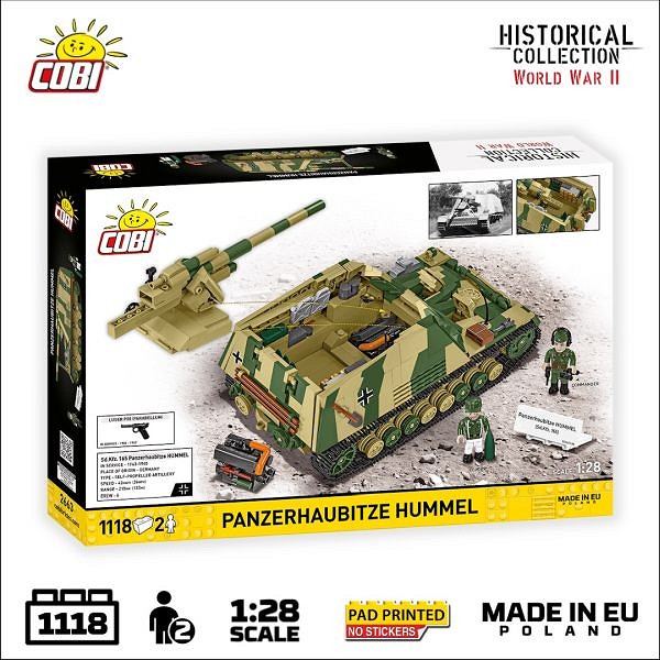 Model Sd.Kfz. 165 Panzerhaubitze Hummel w skali 1:28 to wiernie odwzorowane działo samobieżne niemieckich sił zbrojnych. Zestaw składa się z 1 118 elementów i zawiera dwie figurki żołnierzy w historycznych mundurach. Otwierane włazy, ruchome działo, realistyczne gąsienice i detale konstrukcji sprawiają, że model nadaje się zarówno do ekspozycji, jak i zabawy. Wszystkie nadruki wykonano bezpośrednio na klockach, co gwarantuje trwałość i wysoką jakość wykończenia, oraz zadowolenie dla kolekcjonera.