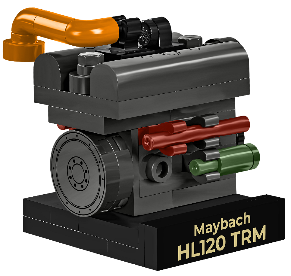 Removable engine – under the removable service hatch is the engine compartment holding the Maybach HL120 TRM engine. The engine can be removed and placed on a stand featuring the engine name.