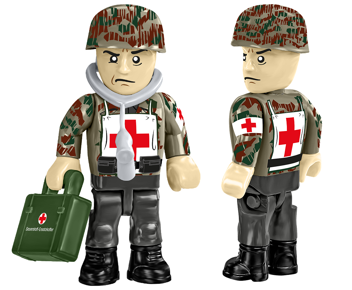 • A paratrooper medic (Fallschirmjäger) – wearing a camouflaged helmet and uniform with added red cross markings. He has a first aid kit, stretcher and stethoscope at his disposal.