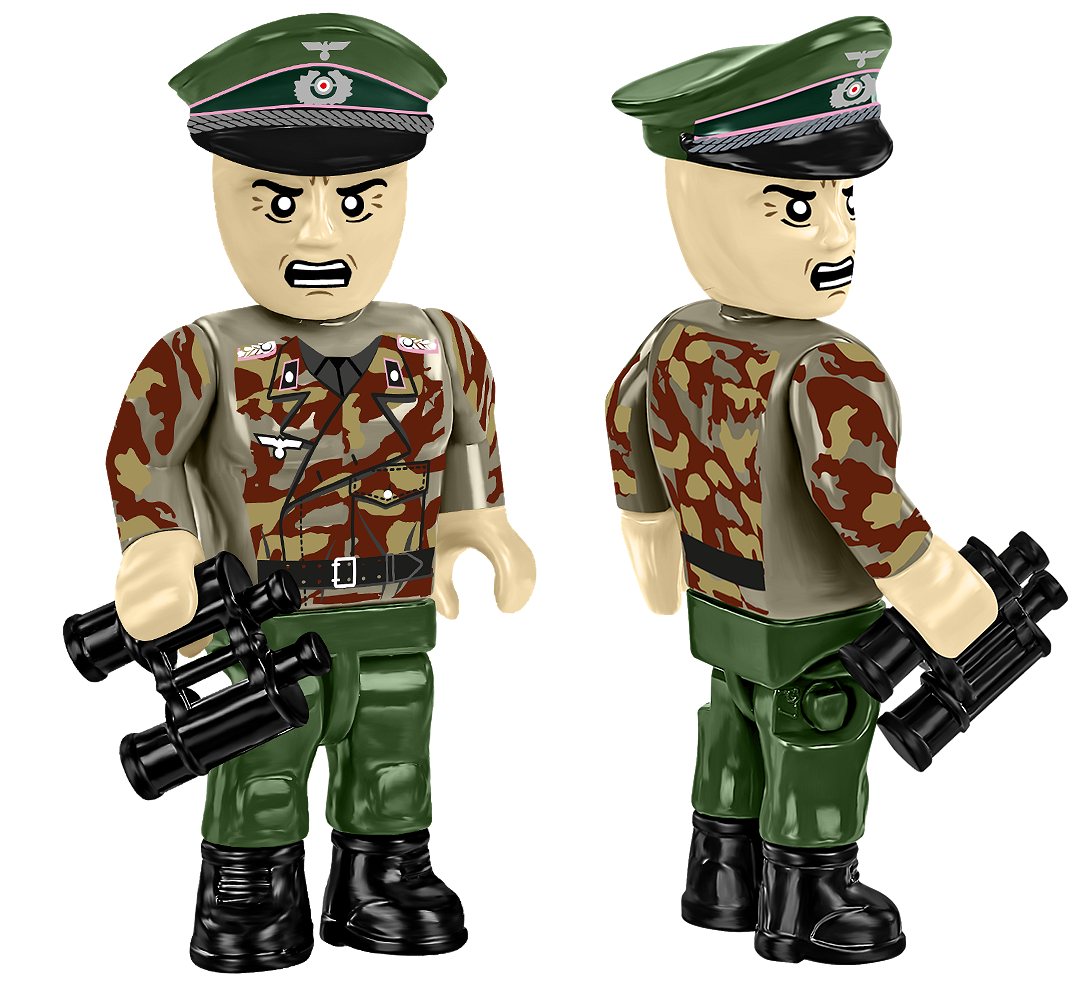 • Tank Destroyer Commander – Dressed in green trousers and camouflage uniform. He wears an officer's cap and holds binoculars.