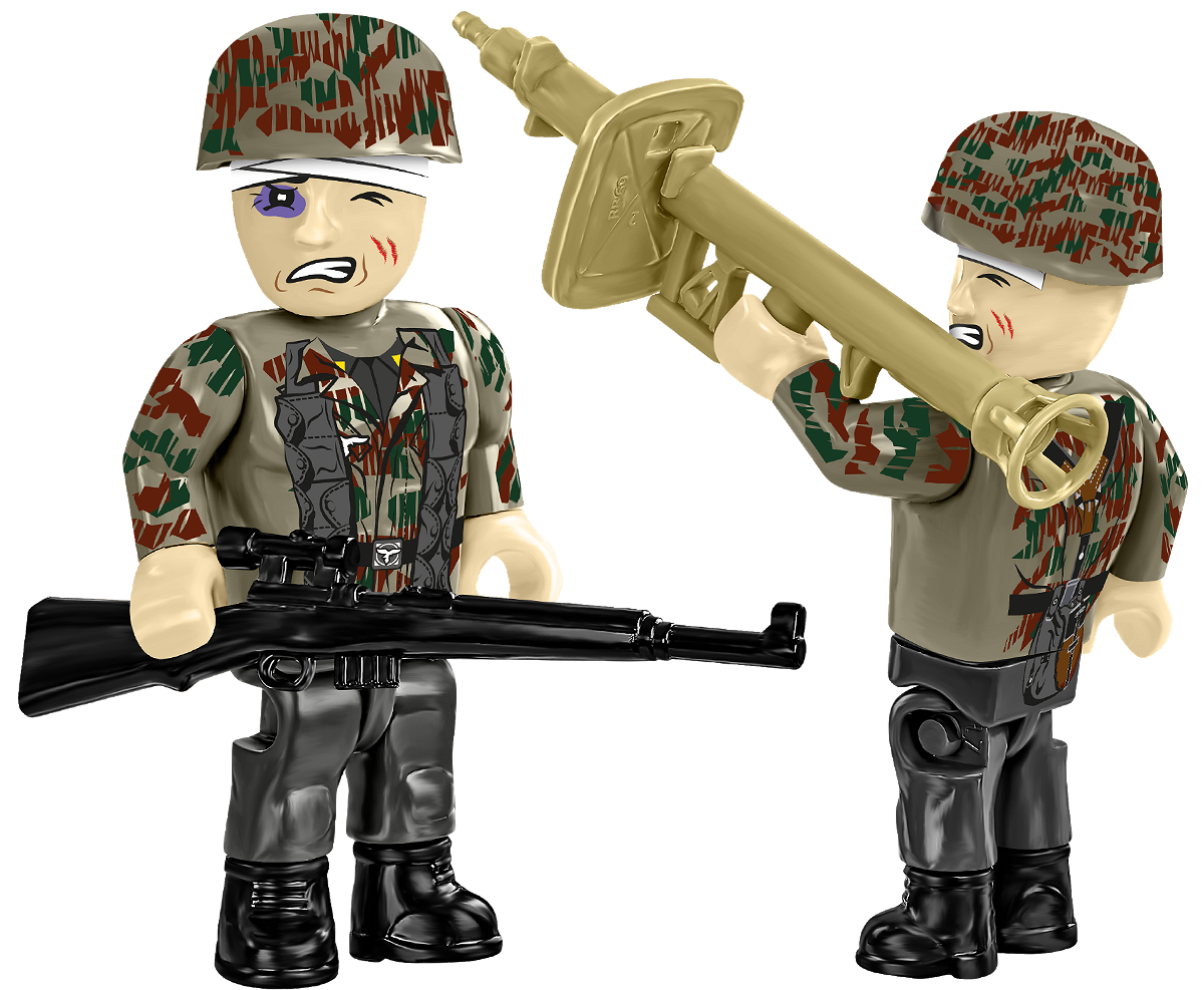 • A German Fallschirmjäger – dressed in a uniform tunic and a camouflaged paratrooper helmet. His weaponry includes a Gewehr 43 sniper rifle and a Panzerschreck anti-tank grenade launcher.