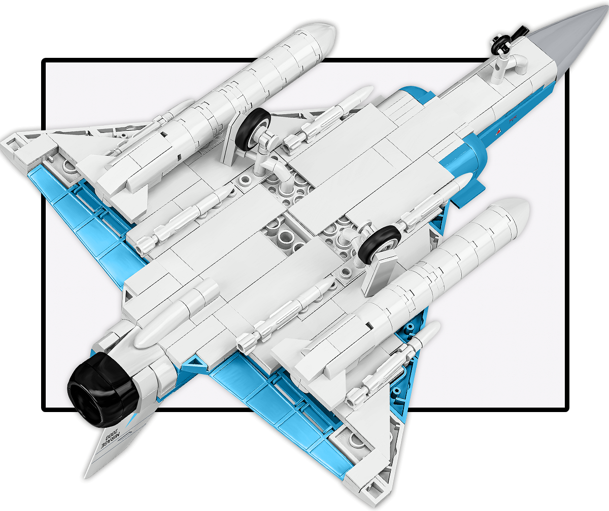 Mirage 2000-5F Brick Model – a set designed with meticulous attention to the proportions and distinctive details of this specific fighter variant. Its sleek fuselage lines, blue-and-white camouflage, and underwing armament give it a modern, combat-ready appearance.