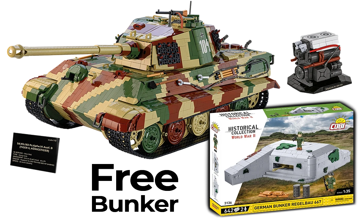 Second Set for Free! Together with the massive Tiger II model, we are including the German Bunker Regelbau 667 in 1:35 scale. This highly detailed model allows you to recreate a functional bunker, one of the key elements of German defensive positions during World War II. The set is enriched with numerous accessories such as vegetation camouflage, supply barrels, sandbags, a KwK 39 L anti-tank gun, radio stations, grenades, as well as MP-40 and Mauser Kar98k rifles. The box also includes two German soldier figures.
